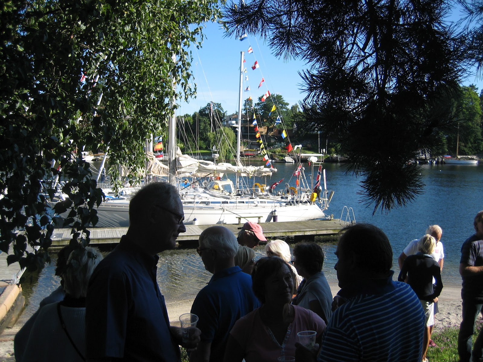 Vi ankommer presis kl 1600 - som planlagt - og klapper til kai etter en æresrunde. Det skytes salutter og tutes så det høres helt til byen. Det står mange på land, og vi blir over 60. Bente K og Tore har ordnet til fest, og med god hjelp blir det champis, pølser, øl og dram, caipirinja, kaker, og etter hvert nattmat og vin. Historiene er mange og gjensynsgleden stor, så det er langt på natt før de siste sykler hjem eller tusler ned i båtene sine. Neste morgen ligger fortsatt de tre følgebåtene med mannskapet utenpå Anne Mari, og vi avrunder med en lang og hyggelig frokost.